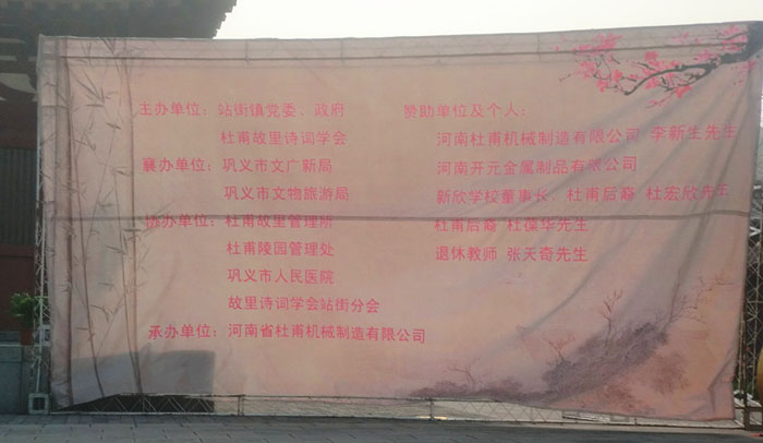 2014年4月4日清晨,由我公司-河南省杜甫機械制造有限公司為承辦單位的“第二屆清明文化節祭拜詩圣杜甫典禮”在鞏義市站街鎮杜甫故里紀念館中隆重舉行。此次祭拜詩圣典禮是繼2013年后的第二屆祭拜詩圣活動。是由站街鎮黨委、政府以及杜甫故里詩詞學會主辦,杜甫故里管理所等單位協辦的。